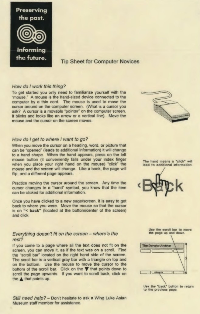 The Archives Team recently came across a “Tip Sheet for Computer Novices” to help community members interact with the Digital Archives. It is a true artifact of the time, explaining that a mouse “is used to move the cursor around the computer screen,” and noting that if the “text does not fit on the screen, you can move it, as if the text was on a scroll.”