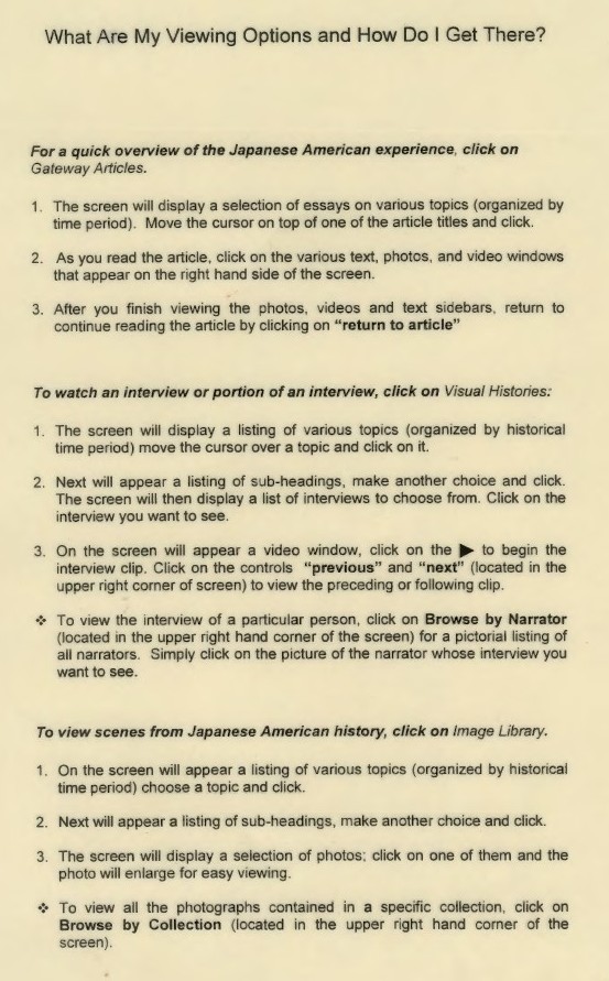 But beyond reminding us of those early personal computer days, we again see the basis for all of Densho’s work over the next 30 years, with guidelines on accessing articles, interviews, photos, and documents.