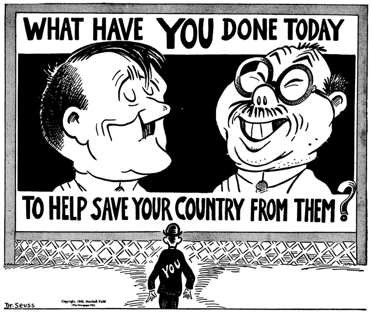 In contrast, Seuss’s depictions of Japanese Emperor Hirohito moved beyond stylistic exaggeration into the realm of racist caricature. Aside from the spectacles and a thin mustache attributable to the Japanese monarch, the buck-toothed smile, stuffed cheeks, extremely slanted eyes, and upturned nose in these illustrations created an amalgamation of features to create a sniveling villain of foreign proportions, rather than an exaggerated human likeness. It is often jarring to see how dignified a figure like Hitler appears in these cartoons compared to the wide-mouthed sneer and air of idiocy granted to his Japanese counterpart.