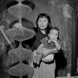 And lastly, there is Ruth Asawa (Jan. 24, 1926 to Aug. 5, 2013). Like Sekimachi, Asawa’s wartime incarceration as a teenager proved to be a formative artistic experience: from observing the weaving of camouflage nets at Santa Anita or learning from older incarceree artists at Rohwer. Although she was born and grew up in Norwalk, California, she became strongly associated with the San Francisco Bay Area after the war. After leaving camp, she studied at Black Mountain College, an experimental art school in North Carolina, and traveled in Mexico, where she first observed the looped wire form she would hone into her signature hanging wire sculptures. She met architect Albert Lanier at Black Mountain, and the two married in San Francisco, where they built their home, all while Asawa continued to create art, exhibit, and raise six children. Asawa is also celebrated for her public art—some of which explicitly draws on her wartime incarceration—and her teaching and activism. Since her passing, her fame has skyrocketed. In recent years, a full biography, several exhibit catalogs, and four children’s or young adult books have been published about her life and work, and her looped wire sculptures have been featured on a series of postage stamps. Most recently, a sprawling retrospective exhibition focused on Asawa was created at New York’s Museum of Modern Art—a large exhibit that will be there on her 100th birthday. One of my New Year’s resolutions is to go see it. It should be one of yours as well!