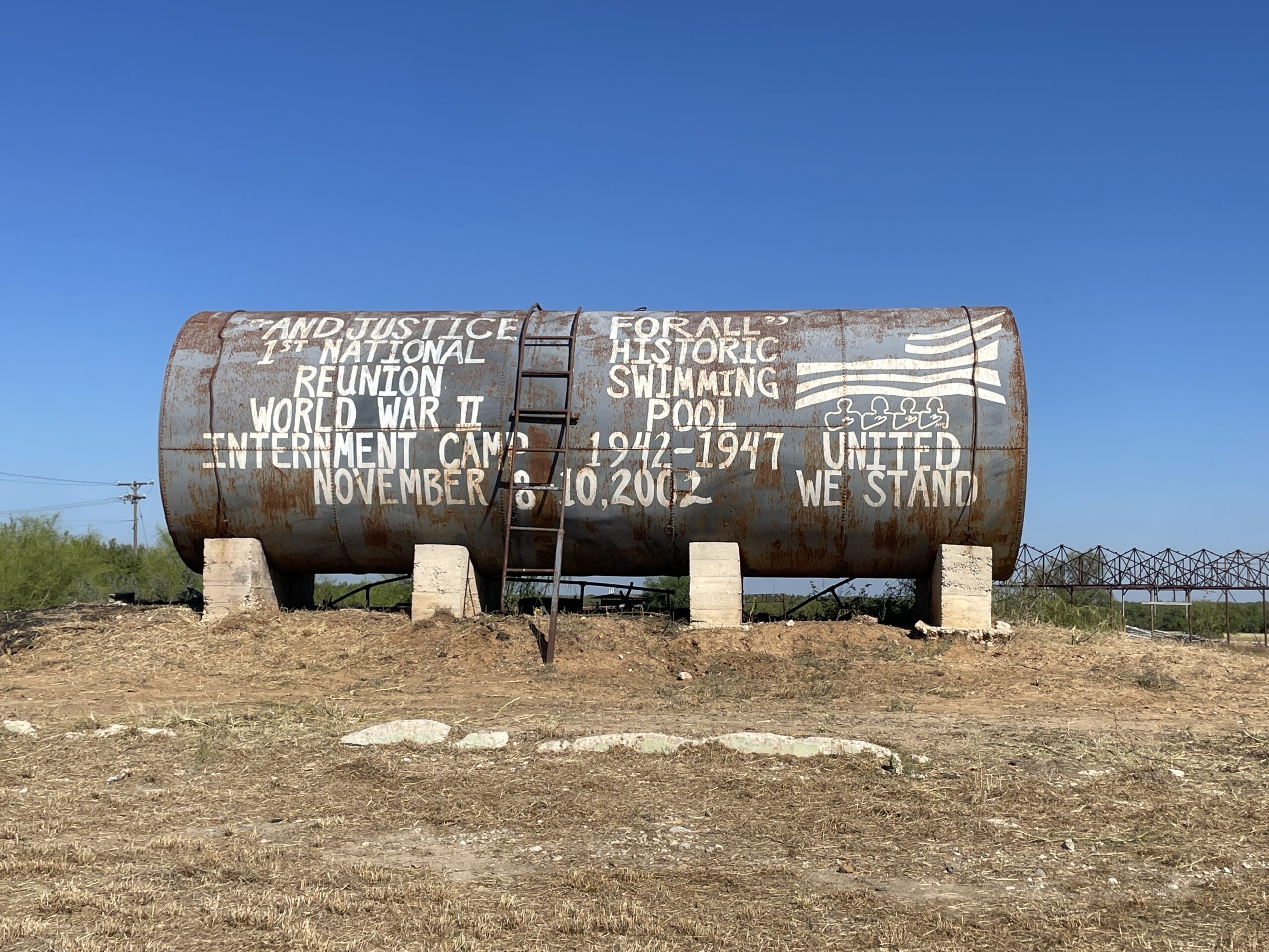 On Day 2 of the pilgrimage, participants visited the former site of the swimming pool at the Crystal City Internment Camp, which also has a marker honoring two Japanese Peruvian girls, Sachiko Tanabe and Aiko Oyakawa, who drowned in 1944. A rusted tank, painted for the 2002 Crystal City Pilgrimage, still stands with the words “And justice for all” and “United we stand,” reminders of ongoing efforts to honor this history.