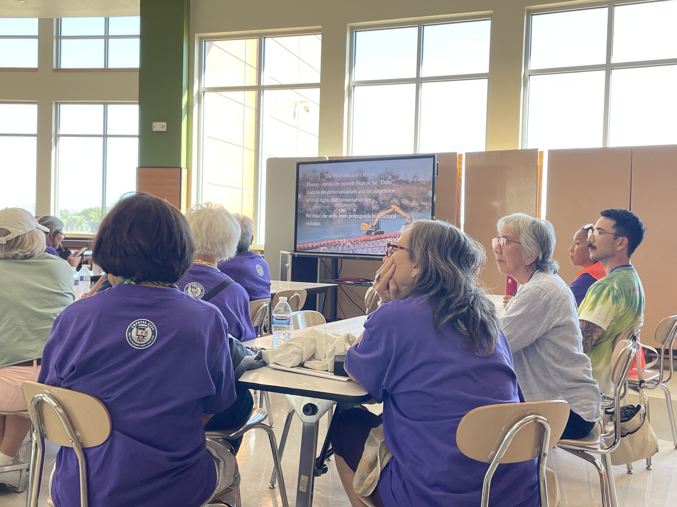 Traveling through Uvalde, Texas on our way south—a region shaped by migration and memory—we were reminded of how the histories of incarceration and immigration intertwine. Under the theme “Neighbors Not Enemies,” speakers at the 2025 Crystal City Pilgrimage reflected on the enduring power of xenophobia disguised as “national security,” tracing its roots from the Alien Enemies Act to the present. Pilgrimage Committee member Karissa Tom grounded the weekend with a powerful reminder: “We know what is legal is not always just,” connecting the experiences of Japanese Americans to broader struggles for justice today, including solidarity with Palestine.