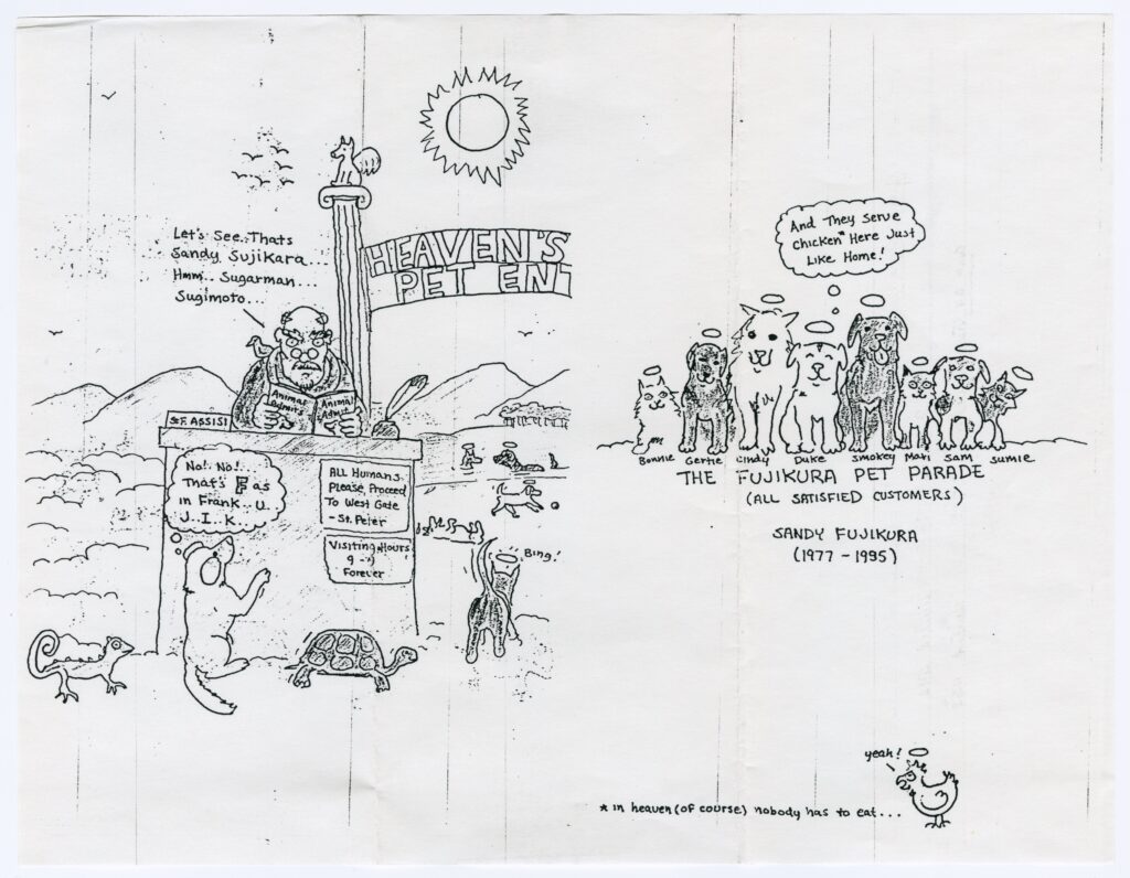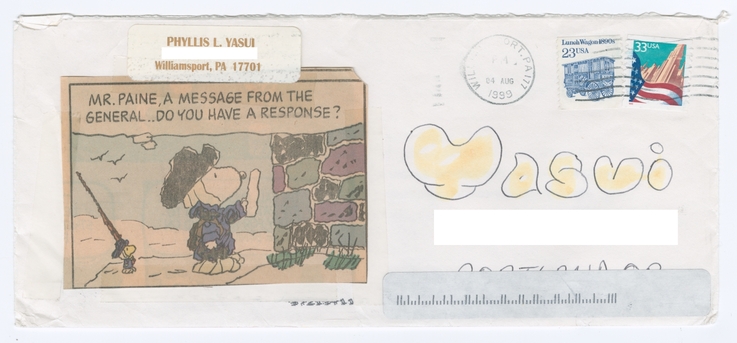 During the 1980s and 1990s, the three wrote to each other frequently, often sharing updates about their families and travels while exchanging holiday and birthday cards. In his 2003 interview with the Japanese American Museum of Oregon, Homer described Yuka as a “prolific letter writer,” which is evident throughout the Yasui Family Collection. Her love for dogs appears frequently in her letters, reflected in paw-print stamps on envelopes, dog-themed holiday cards, and hand-drawn cartoons of her pets. Yuka’s correspondence rarely arrived without a cartoon glued to the envelope, often featuring Snoopy, hinting at her fondness for dogs as well.