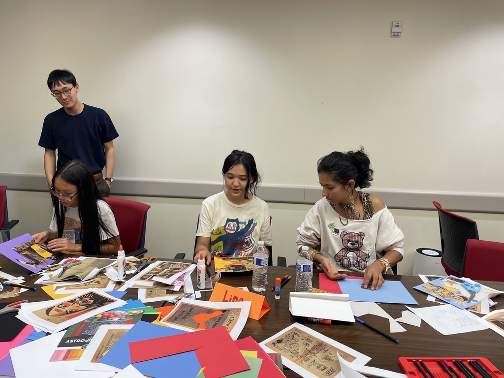 In the final portion of the workshop, students created their own zine pages on topics that mattered to them—echoing Gidra’s spirit of activism and self-expression. Their creations celebrated friendship and family, called for greater Asian American representation, and voiced frustration with Texas’ recent ban on diversity, equity, and inclusion initiatives in public schools.