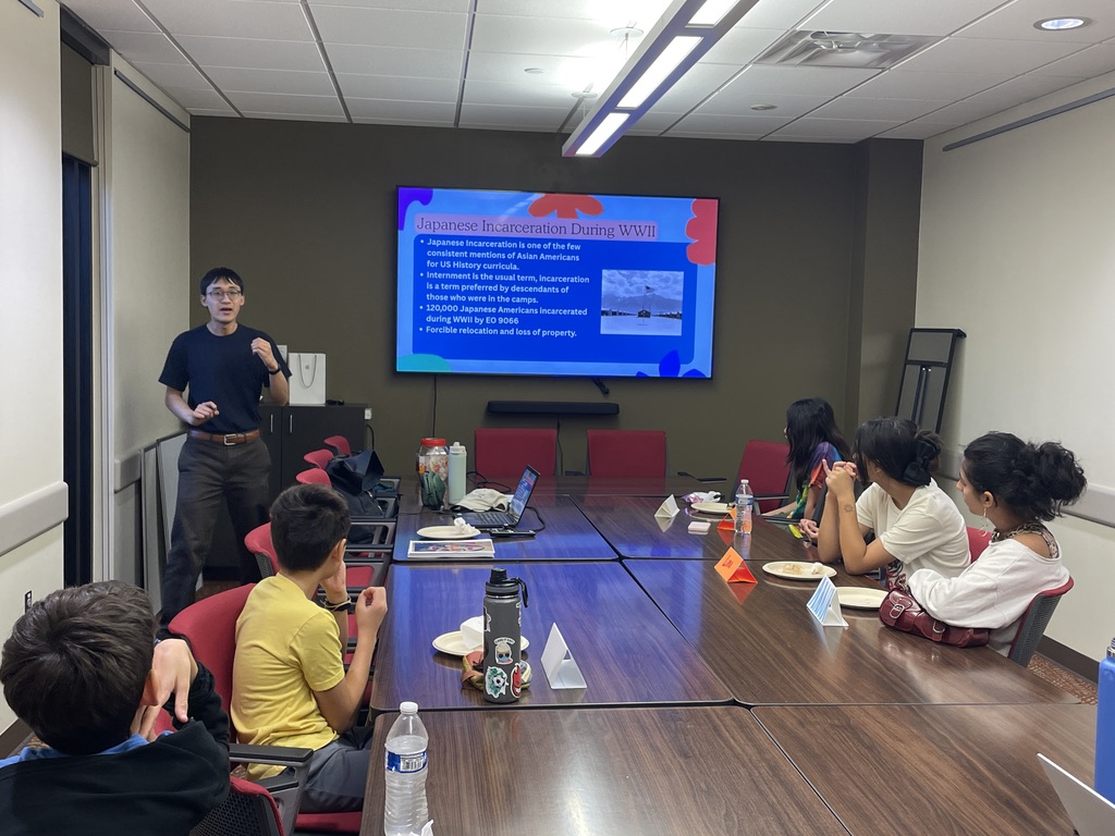 The workshop began with an introduction to Japanese American wartime incarceration. Youth Voices Rising facilitator James Lemuel provided historical context, connecting this chapter of U.S. history to broader global patterns of imperialism and exclusion faced by early Japanese immigrants.