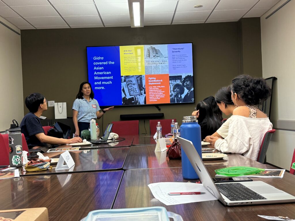 Students then learned about the history of Gidra, including how it emerged from the Asian American movement to challenge silence, erasure, and distorted narratives about Japanese American incarceration. They explored how the publication supported the 1980s Redress Movement and built solidarity across communities of color, including through its coverage of pilgrimages to former incarceration sites.